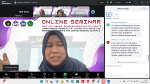 Suasana seminar semakin hidup dengan adanya kuis interaktif yang mendorong partisipasi aktif peserta serta menambah wawasan mereka mengenai dunia penelitian dan publikasi ilmiah. Diskusi dan sesi tanya jawab berlangsung dinamis, menunjukkan antusiasme tinggi dari peserta meskipun kegiatan dilaksanakan secara daring.