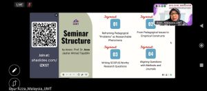 Prof. Madya Azza Jauhar Ahmad Tajuddin, Ph.D. menyampaikan materi berjudul “From Classroom Challenges to Scopus-Indexed Research: A Pedagogical to Empirical Framework”, yang membahas bagaimana permasalahan nyata di ruang kelas dapat dikembangkan menjadi penelitian empiris yang layak dipublikasikan pada jurnal terindeks Scopus.