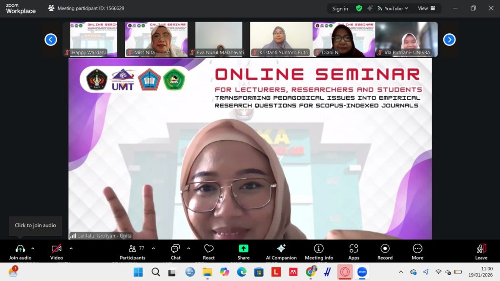 Kediri — Fakultas Keguruan dan Ilmu Pendidikan (FKIP) Universitas Islam Kadiri (UNISKA) sukses menyelenggarakan Online Seminar bertajuk “Transforming Pedagogical Issues into Empirical Research Questions for Scopus-Indexed Journals” pada Senin, 19 Januari 2026. Kegiatan ini dilaksanakan secara daring melalui Zoom Meeting dan berlangsung dengan lancar serta penuh antusiasme.