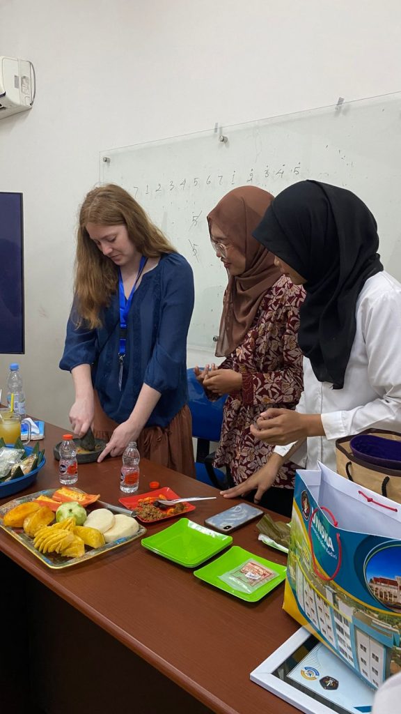 Tidak hanya mencicipi, Ms. Ava juga mencoba membuat rujak buah secara langsung dan belajar mengulek bumbu rujak. Dalam kesempatan tersebut, Ms. Ava menyampaikan bahwa ia tidak terlalu menyukai rujak yang terlalu pedas, sehingga saat mengulek bumbu, ia hanya menambahkan satu buah cabai ke dalam rujaknya. Momen ini menciptakan suasana akrab dan penuh tawa, sekaligus menjadi pengalaman budaya yang berkesan.