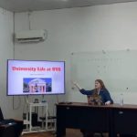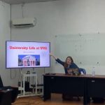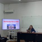 Ms. Ava menjelaskan perbedaan sistem perkuliahan antara Indonesia dan Amerika Serikat. Ia menyampaikan bahwa mahasiswa di University of Richmond terbiasa berpindah kelas dan gedung untuk setiap mata kuliah.
