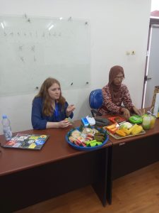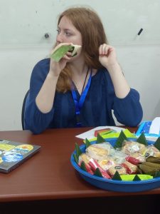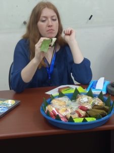 Suasana kegiatan semakin hangat pada sesi pengenalan kuliner tradisional Indonesia. Ms. Ava berkesempatan mencicipi berbagai makanan dan minuman khas Indonesia seperti klepon, onde-onde, kue lapis, es cendol, serta jamu kunir asem. Saat mencicipi kue lapis, Ms. Ava memberikan komentar spontan yang mengundang senyum para peserta.